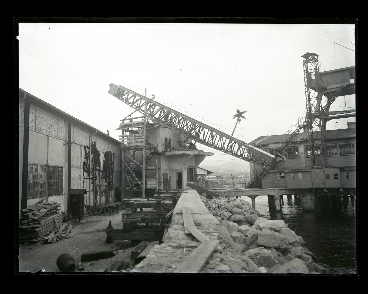 Operai a lavoro sulla catapulta per il collaudo degli aviosiluri del silurificio Whitehead di Fiume