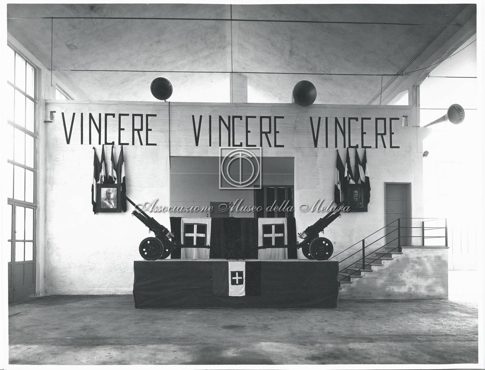Palco nel salone allestito per comizio fascista