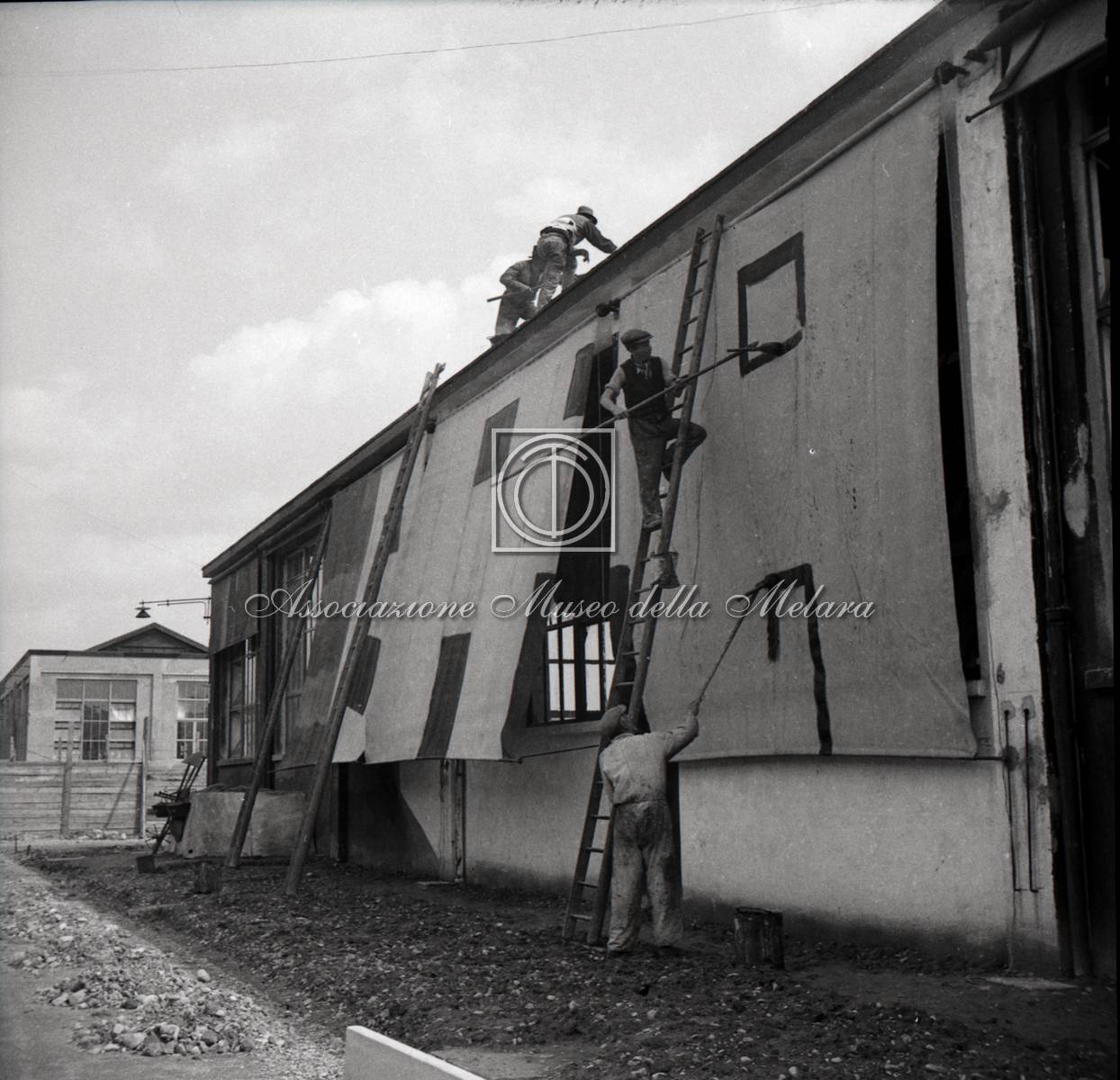 Media with "Is Part Of: Operai al lavoro per la mascheratura degli edifici"
