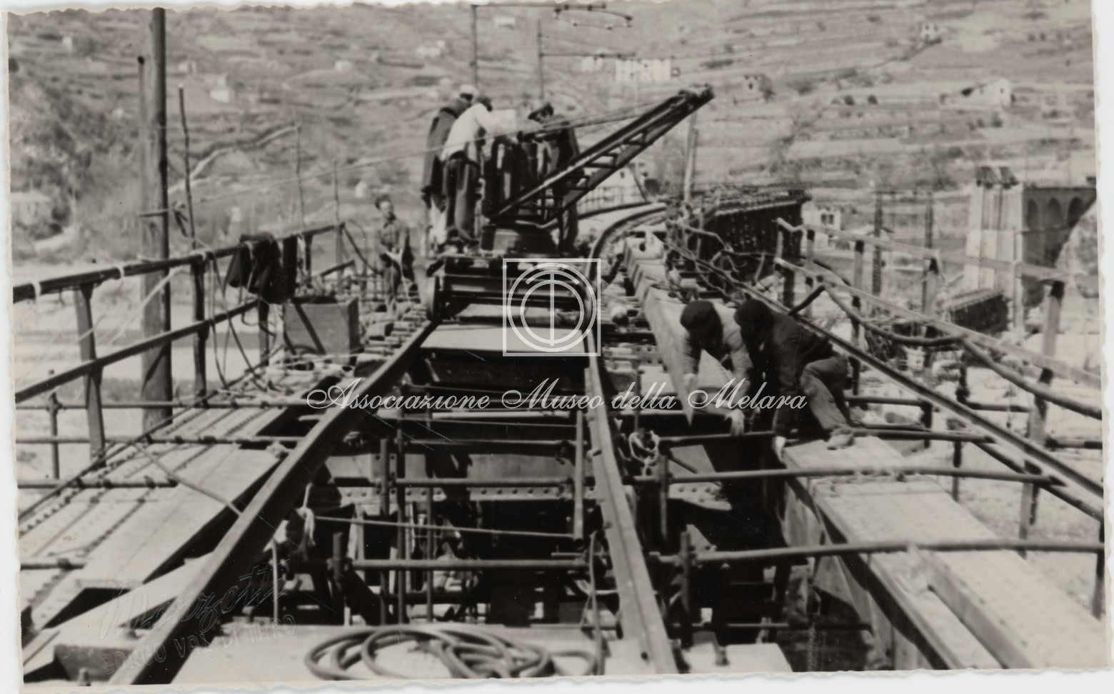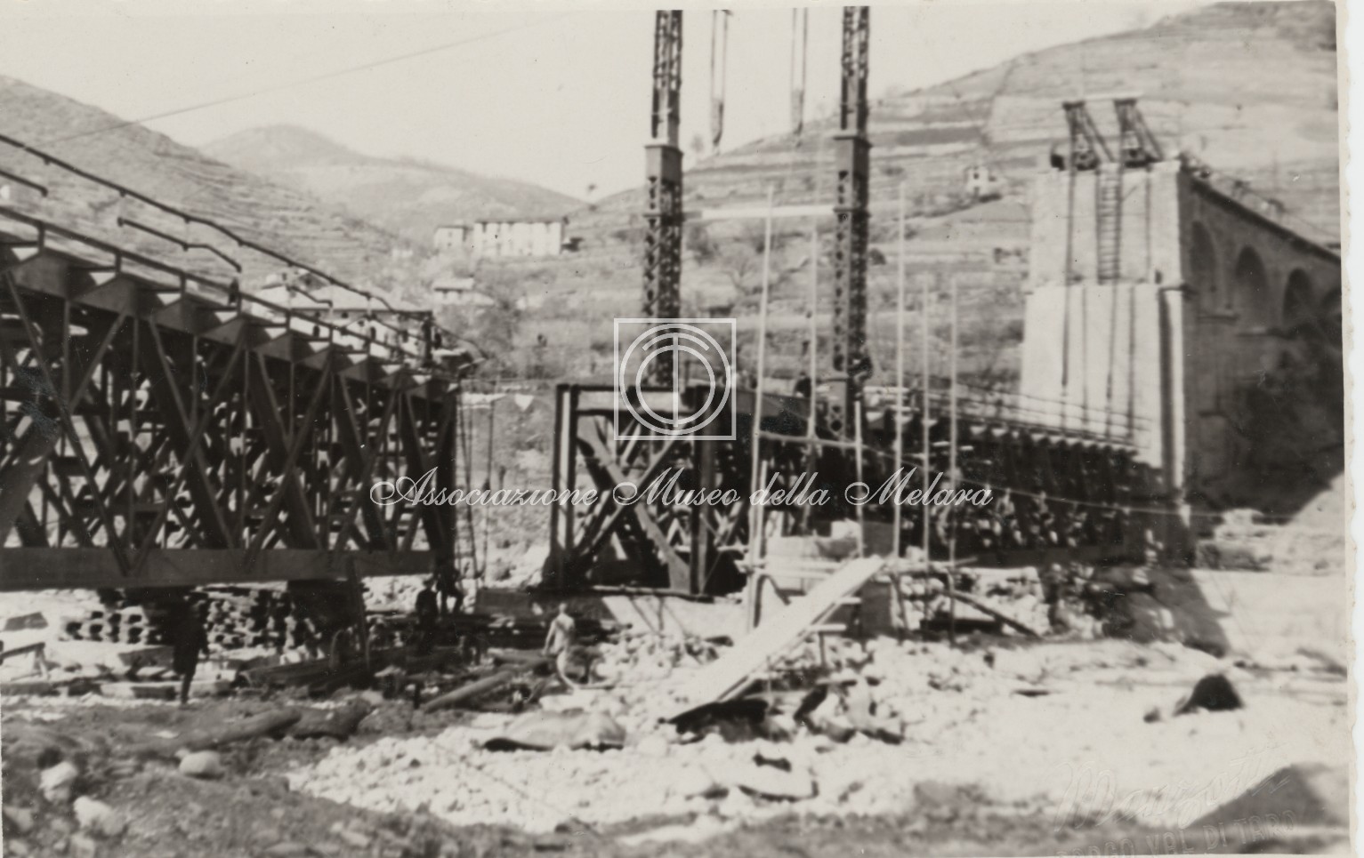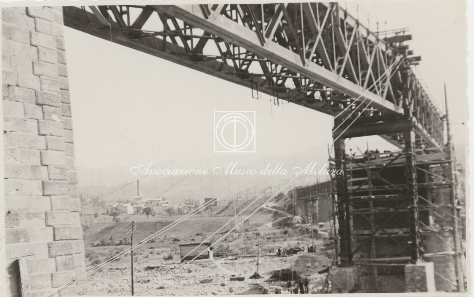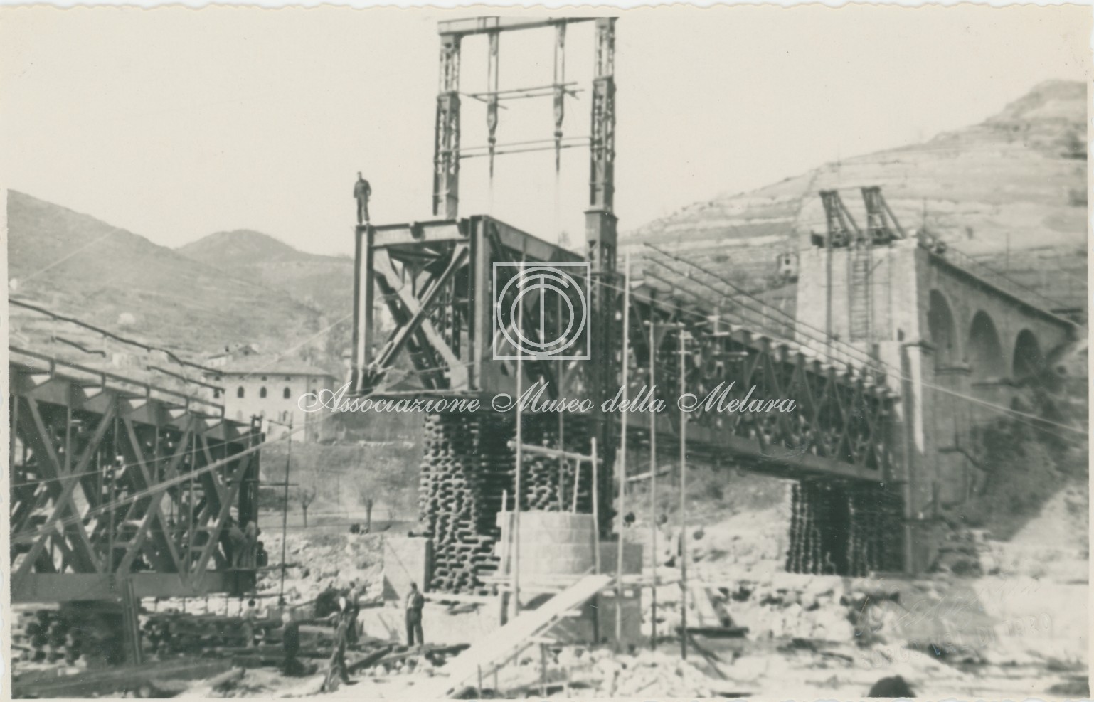 Gli scatti, di vario formato, documentano i lavori di ricostruzione del ponte ferroviario di Borgo Val di Taro, in provincia di Parma, distrutto dai bombardamenti nel corso della Seconda Guerra Mondiale. La data di compilazione dell’album risale al 29 maggio 1946, e le fotografie sono probabilmente databili allo stesso anno e a quello precedente, quando, dopo la Liberazione e la fine della guerra, gli stabilimenti spezzini della Odero Terni Orlando inaugurarono, o meglio, intensificarono la produzione civile e ferroviaria.