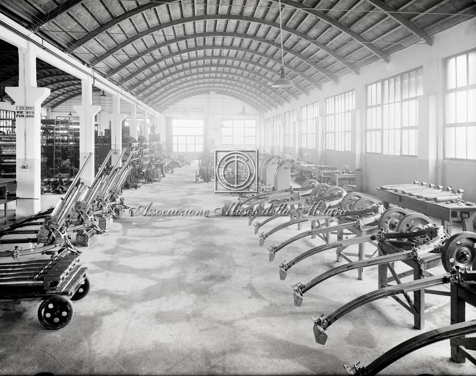 Interno di magazzino con pezzi di artiglieria